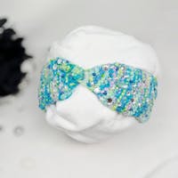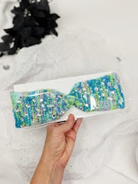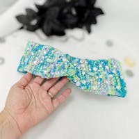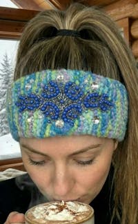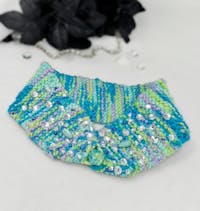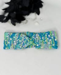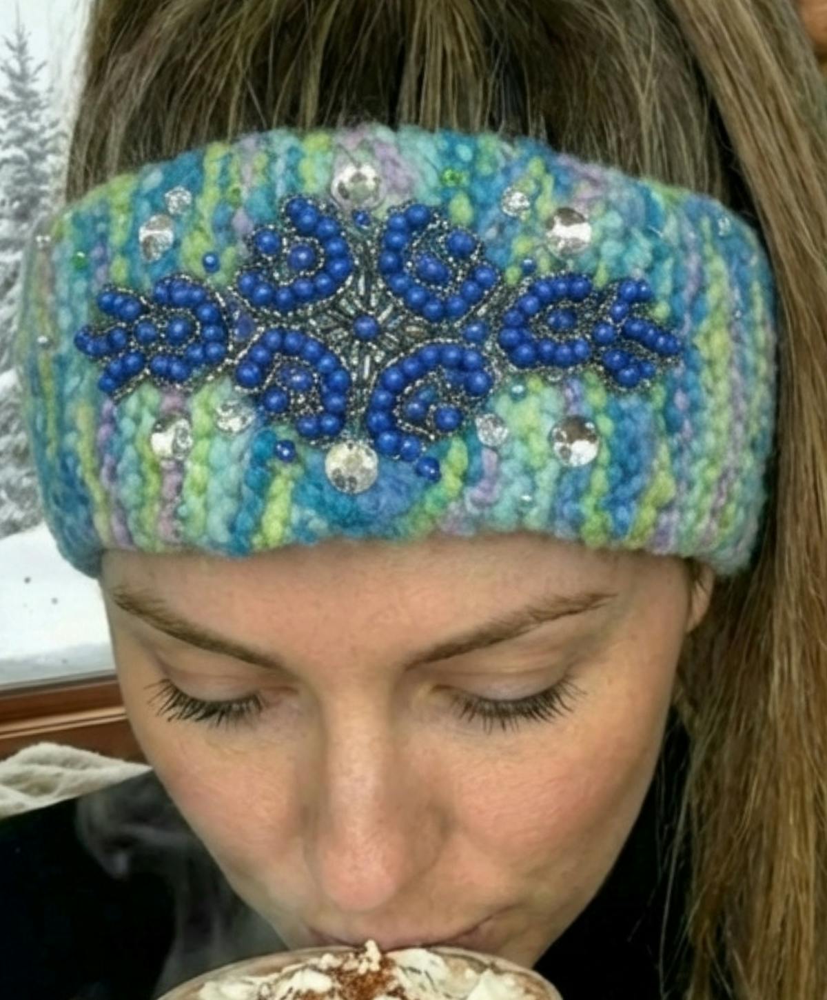 Cozy meets couture. This turquoise hand-knit headwrap features an upcycled applique and crystal beads that catch the light beautifully โ the kind of accessory that sparks conversations.