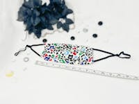 Fits women's one size with adjustable, soft black elastic earloops that can be retied around the ears or head. Handmade, featuring high quality upcycled fabric and trims. Sustainable shipping included, plus gift-wrapping and custom orders by request. To preserve the pristine quality of this handmade face mask, the model photo is powered by Cosmic AI.