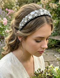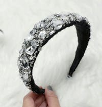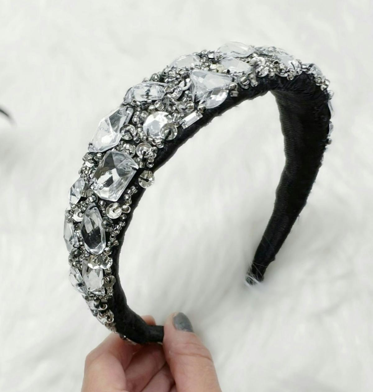 Lightly padded, upcycled base lined with black lace and elastic for a comfortable fit for women's, one size. Handmade from high quality, upcycled fabric and crystal rhinestone beading. Sustainable shipping included, plus gift wrapping and custom orders by request. To preserve the pristine quality of this handmade headband, the hover photo is powered by Cosmic AI.