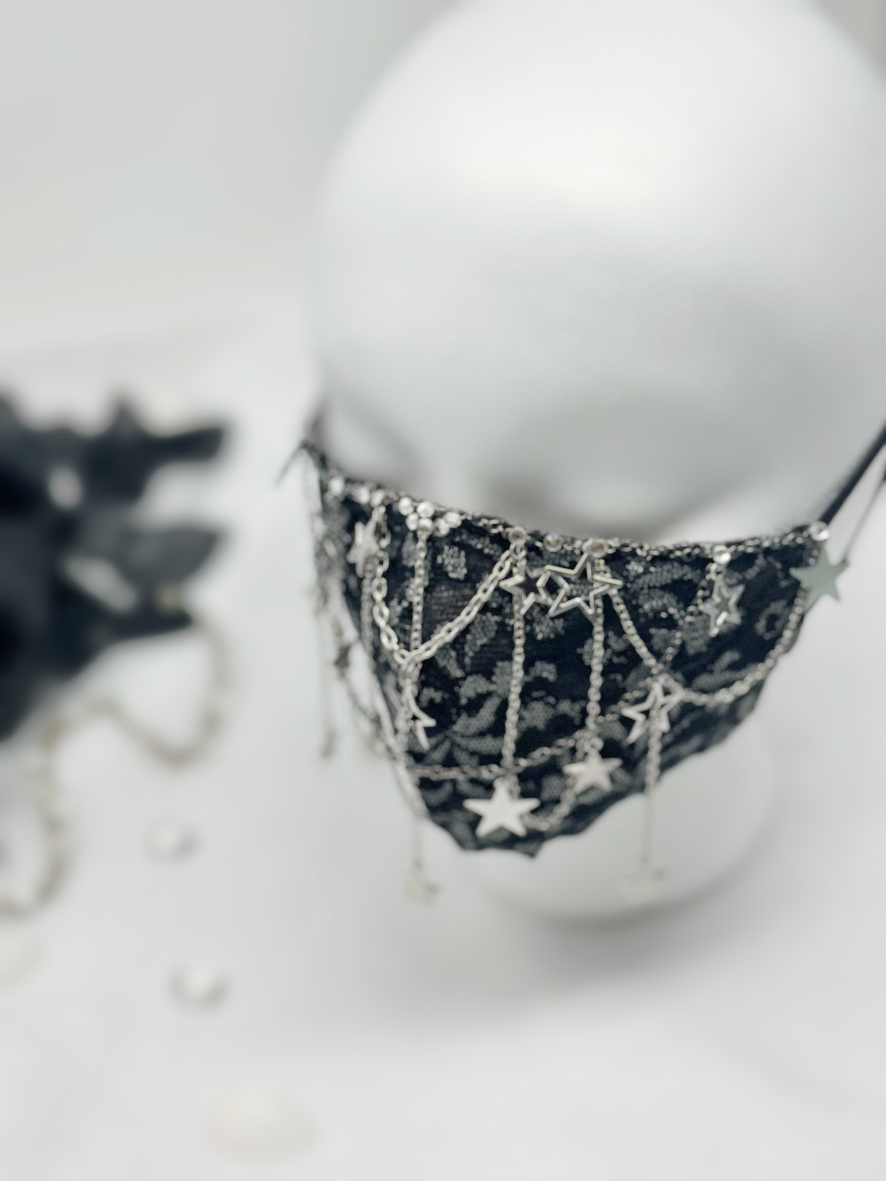 You will feel sexy and elegant when you wear this gorgeous lace face mask with chains and star charms. Perfect for dressing up your whimsigoth style for special occasions, rave wear, festival fashion, gothic weddings, BDSM outfits and handmade gifts for her. The captivating, black and silver floral lace design with rhinestones will keep all eyes on you.