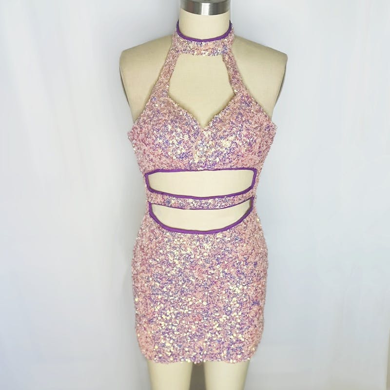 Pink Sequins Halter Dress with Cut Outs