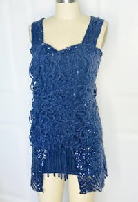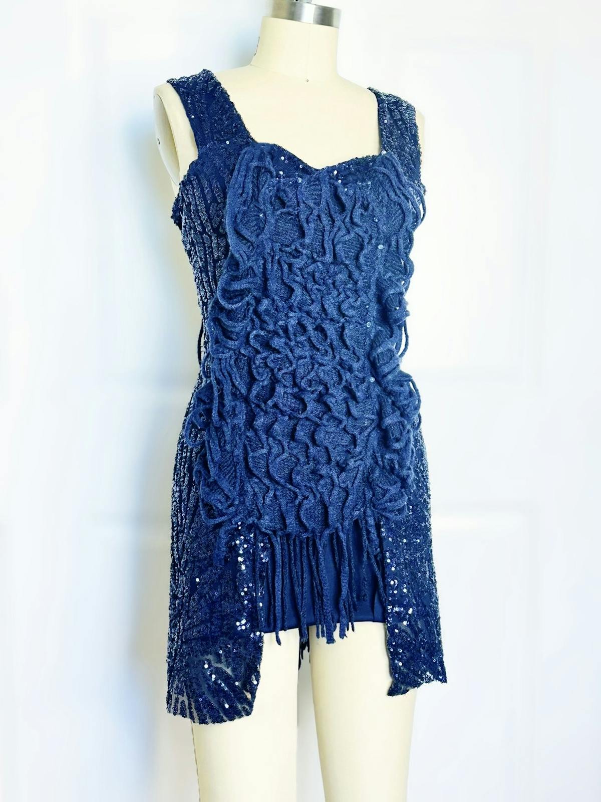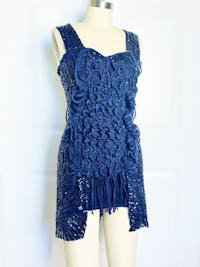 Stretchy pullover fit for women's size medium. Shown on a USA size 8 dress form. One of a kind, sleeveless, mini-length design. Handmade, featuring high quality, up-cycled materials salvaged from the fast fashion industry. Sustainable shipping included, plus gift wrapping by request.
