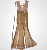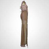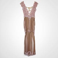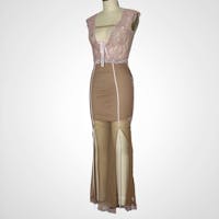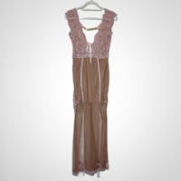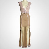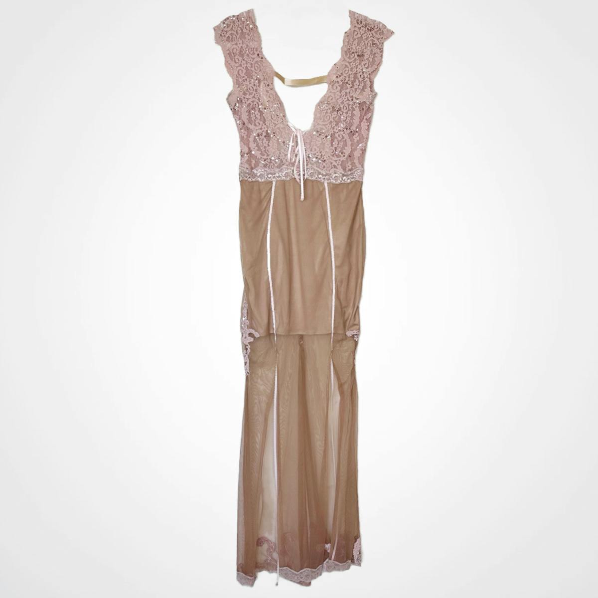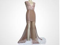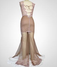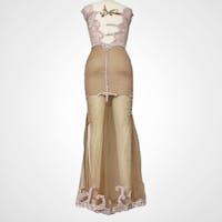 Sheer, cap sleeve bodice with a super soft, stretchy nude, half-lined skirt with Long, princess seam skirt with slits. Adjustable ribbon ties and hook and eye closures at the back. Comfortable fit for women's size medium. Shown on a USA size 8 dress form. As seen on the red carpet worn by Shyra Sanchez.