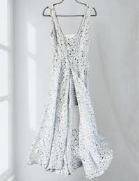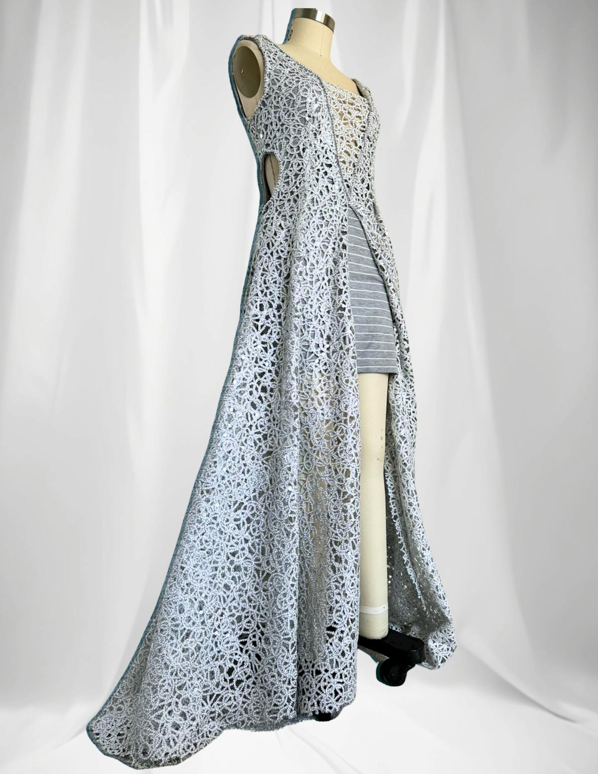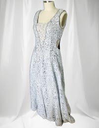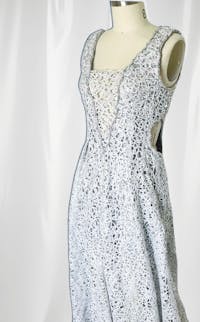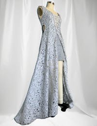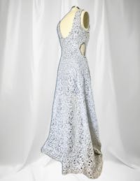 • Sparkly, silver lace maxi gown.