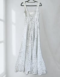 • Floor length dress with long, split skirt.