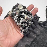 • Hand-beaded rhinestones at shoulders.
