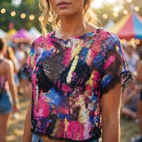 Comfortable, pullover fit for women's size medium. Shown on a USA size 8 dress form. Hand-wash/air dry and spot clean only. Sustainable shipping included, plus gift-wrapping and custom orders by request. To preserve the pristine quality of this one of a kind, handmade crop top, the cover photo is powered by Cosmic AI.