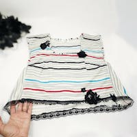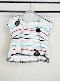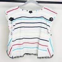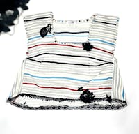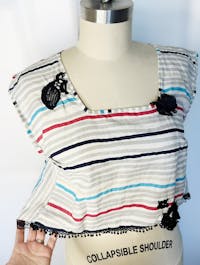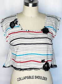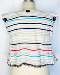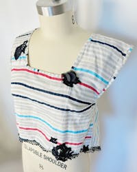 You will feel and look stylish when you wear this gorgeous, one of a kind upcycled crop top with black lace embroidery. The handmade, upcycled linen design features a colorful striped pattern that is perfect for dressing up any outfit to keep you cool and comfortable. You will get so many compliments whenever you wear this elegant cropped top.