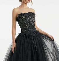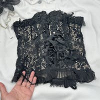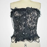You will turn heads in this striking black lace overbust corset, designed to blend Victorian romance with gothic edge. Crafted from intricate floral lace and embellisehd with shimmering beaded chains and butterfly appliques, this corset provides a trus statement piece that will help you dress up for any occasion. The soft ruffled trim along the neckline and hem adds a romantic finish with a super soft, stretchy nude lining that amplifies a sheer illusion. Perfect for evening wear, burlesque styling, red carpet and runway events.