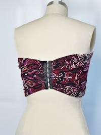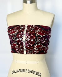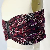 Stretchy, comfortable fit for women's size medium with a hook and eye opening at the back. Shown on a USA size 8 dress form. One of a kind and handmade from high quality upcycled fabrics and trims. Featured at SacAnime.