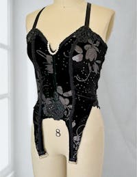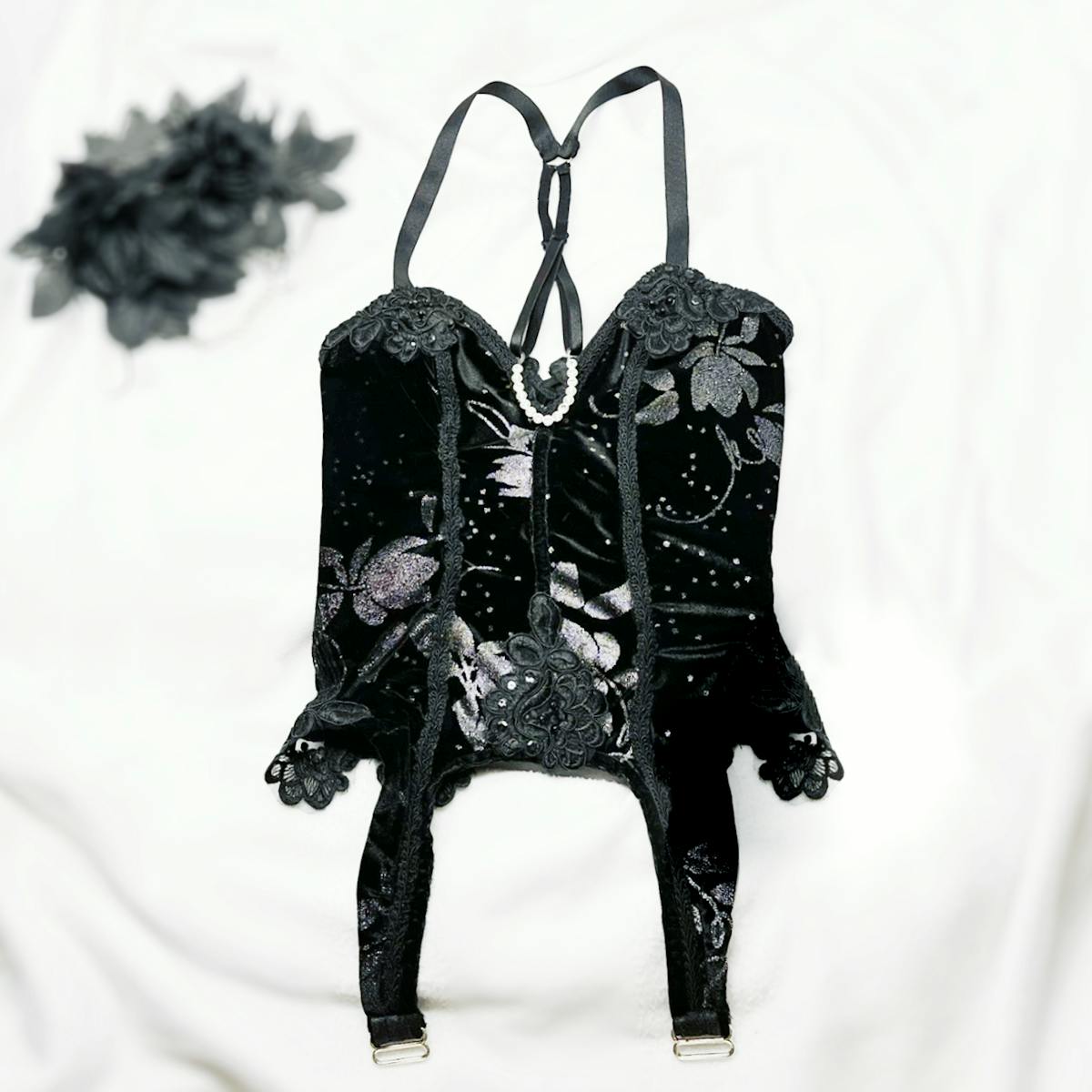 You will feel sexy and elegant when you wear this gorgeous black and silver floral velvet corset with gothic floral embroidery details and a rhinestone broach at the center front. The garter straps and princess seams will get you so many compliments whenever you wear this gorgeous design. Perfect for dressing up your evening wear outfits, special occasions, boudoir photoshoots, gothic wedding attire, masquerade ball cosplay and romantic lingerie gift for her.