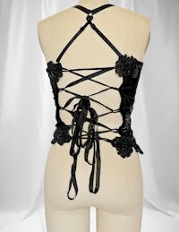 Super soft, stretch velvet with side zipper opening. Adjustable black ribbon straps and lacing at the back. Comfortable fit for women's size medium. Shown on a USA size 8 dress form. As seen at Fashion with a Mission 3.