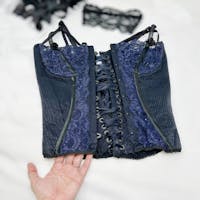 Feel sexy and elegant when you wear this gorgeous, navy blue lace, semi-sheer quilted corset. Perfect for dressing up your intimate occasions, evening wear, editorial photoshoots, masquerade ball attire and romantic wedding gift for her. The sexy, one of a kind design will keep all eyes on you.