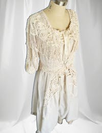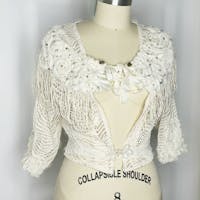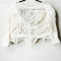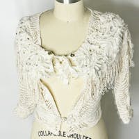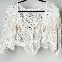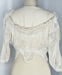 This one of a kind, ivory cream crochet cover-up will make you feel sexy and elegant. The sheer fishnet style with three-quarter sleeves is upcycled with sequins lace and beading. The fringe detail will get you so many compliments. Perfect for dressing up your witchy outfits for special occasions, fall fashion, evening wear, Halloween and Victorian gothic wedding gifts for her.