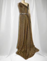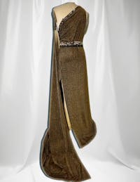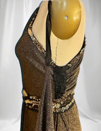 You will feel sexy and elegant when you wear this gorgeous, one of a kind, gold metallic maxi gown with a long, slit skirt and one shoulder design. Sequins elastic belt included so you can style many ways. Featured at Fashion with a Mission.