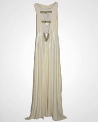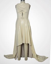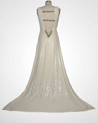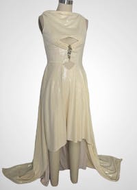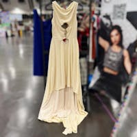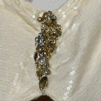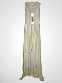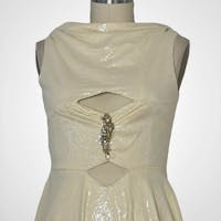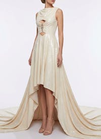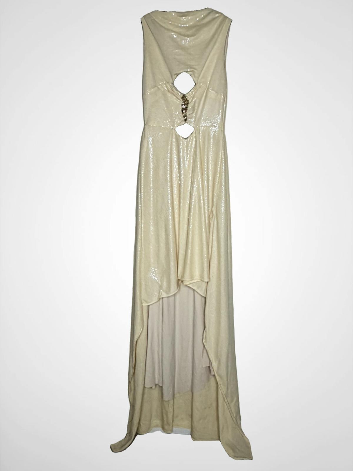This gorgeous, one of a kind, ivory sequins gown features diamond cut outs at the waistline and a glamourous hi-low hem. The sleeveless design with gold crystal beading at the front will make you feel sexy and elegant. Perfect for special occasions, runway events, editorial photoshoots and red carpet attire.