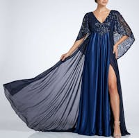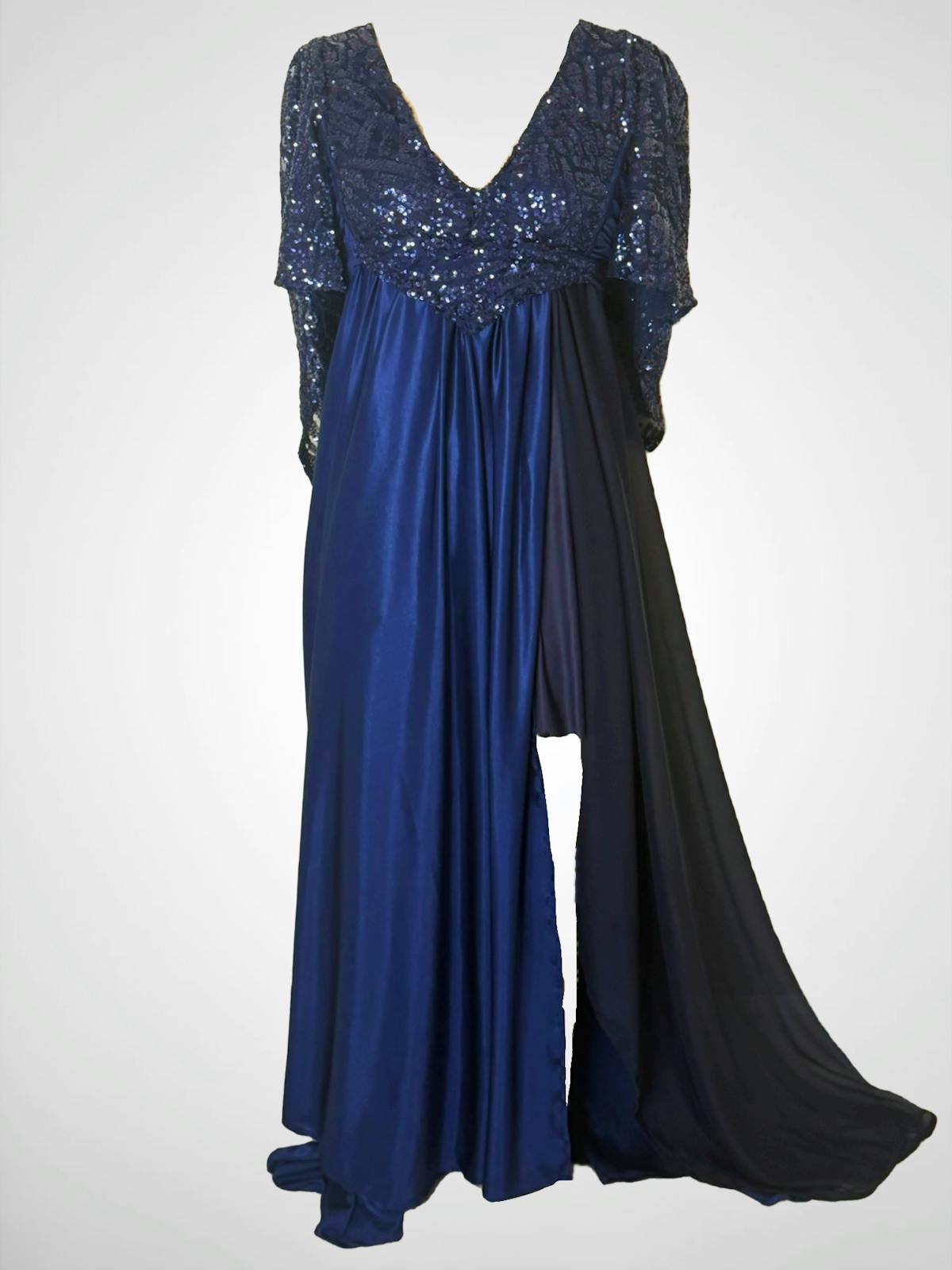 This one of a kind, gorgeous navy blue sequins capelet gown features and empire waistline with a long, flowy side slit skirt. The peek a boo leg opening and adjustable bow sash at the back will make you feel sexy and elegant. Perfect for special occasions, red carpet events, editorial photoshoots and evening wear.