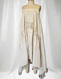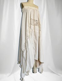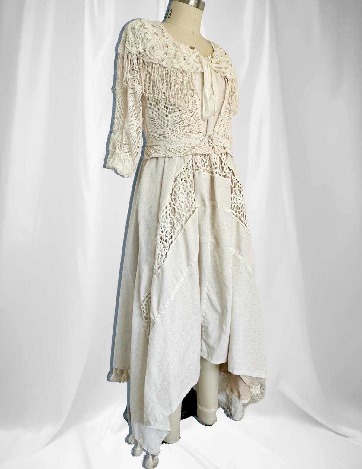 You will feel whimsy and elegant when you wear this gorgeous, one of a kind, beige curtain gown with a matching upcycled crochet lace cardigan. The haute couture style is handmade featuring upcycled linen fabric, lace and rhinestones. The gown can also be worn as a skirt, and styled with our classic hoop skirt. Perfect for editorial photoshoots, special occasions and red carpet events.