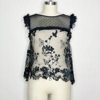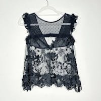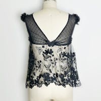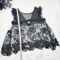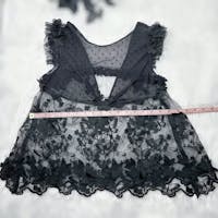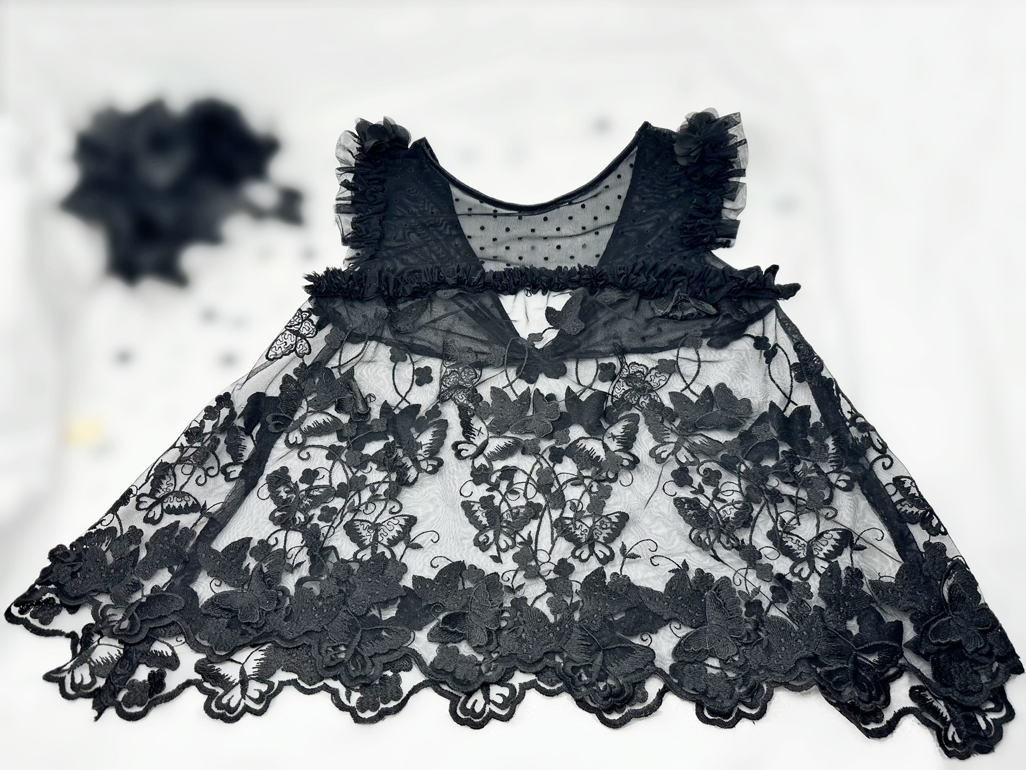 This gorgeous, one of a kind, sheer black butterfly lingerie babydoll will make you feel sexy and elegant. The handmade ruffled details and vintage style pointe d' sprit neckline adds a touch of classic glamour. Perfect for dressing up your intimate occasions, boudoir photoshoots and romantic, Valentine's Day gifts for her. To preserve the pristine quality of this handmade babydoll lingerie, the cover photo is powered by Cosmic AI.