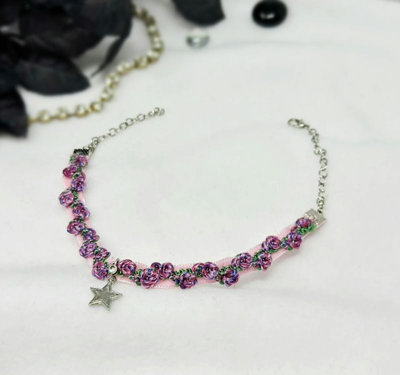 Thin Pink Velvet Choker with star charm, embroidered floral necklace