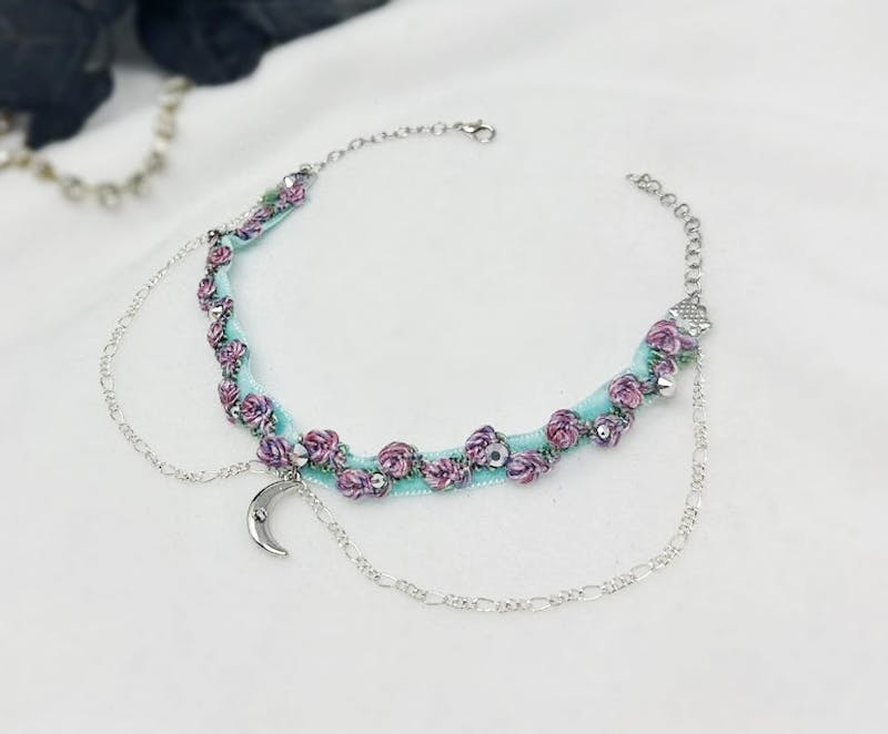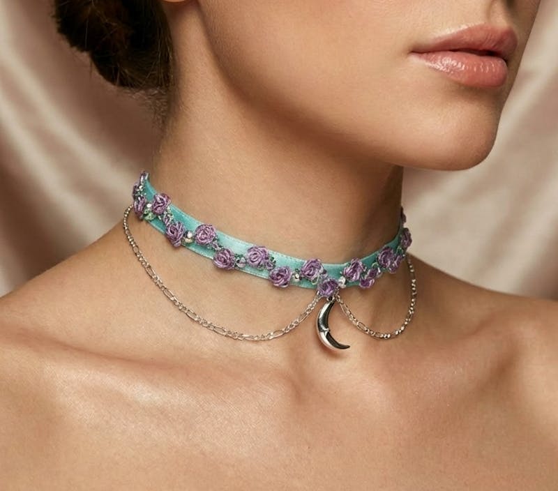 Teal Velvet Choker Embroidered Floral Necklace with Moon Charm and Rhinestones