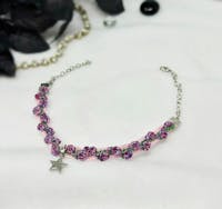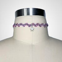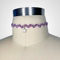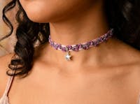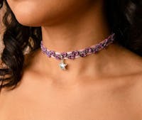 Dainty, enchanting, and impossible to ignore. This pink velvet choker features upcycled floral embroidery trim, sparkling rhinestones, and a dangling star charm at center — a captivating accessory you'll reach for again and again.