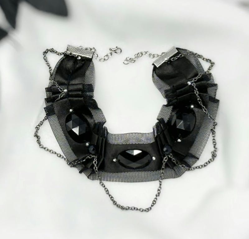 Black Pleated Ribbon collar with rhinestones and chains