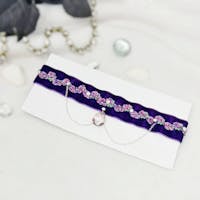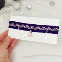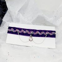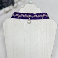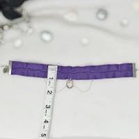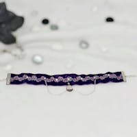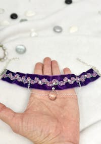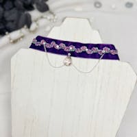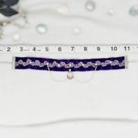 The purple velvet collar band measures 3/4" inch wide with an adjustable chain and lobster clasp. Fits womens, one size, 12"-15" inches around. For custom length add your personalization. Handmade, featuring high quality, upcycled materials. Sustainable shipping included, plus gift-wrapping and custom orders by request. To preserve the pristine quality of this handmade choker necklace, the model photo is powered by Cosmic AI.