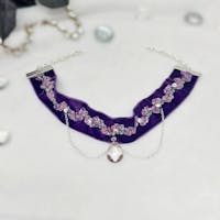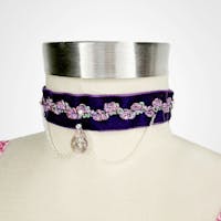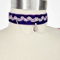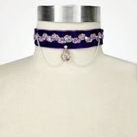 You will feel regal and elegant when you wear this beautiful, purple velvet choker necklace with floral embroidery, rhinestones and layered chains. The teardrop pendant design at the center will keep all eyes on you. Perfect for dressing up your festival fashion, rave wear outfits, special occasions, prom, spring style, fairy cosplay, bdsm sub collar jewelry, Victorian gothic wedding and handmade gifts for her.
