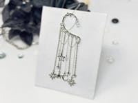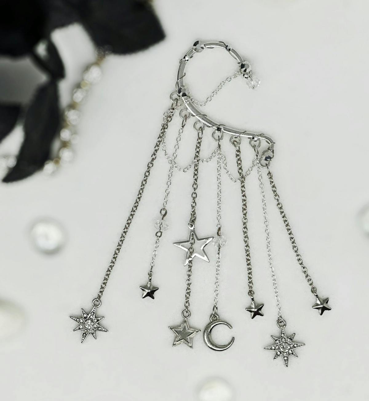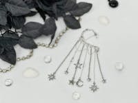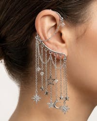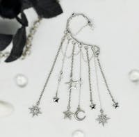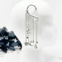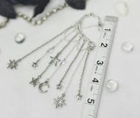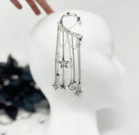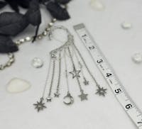 You will feel and look magical when you wear this gorgeous, silver tone, star ear cuff earring. No piercing required! The long, dangle chains and celestial, moon and star charms with rhinestones will keep all eyes on you. This non-pierced ear cuff is the perfect style statement for dressing up any outfit for festival fashion, rave wear, concert attire, date night, boho wedding, fairy cosplay, and handmade jewelry gifts for her. You will get so many compliments whenever you wear this captivating, drop ear cuff design.