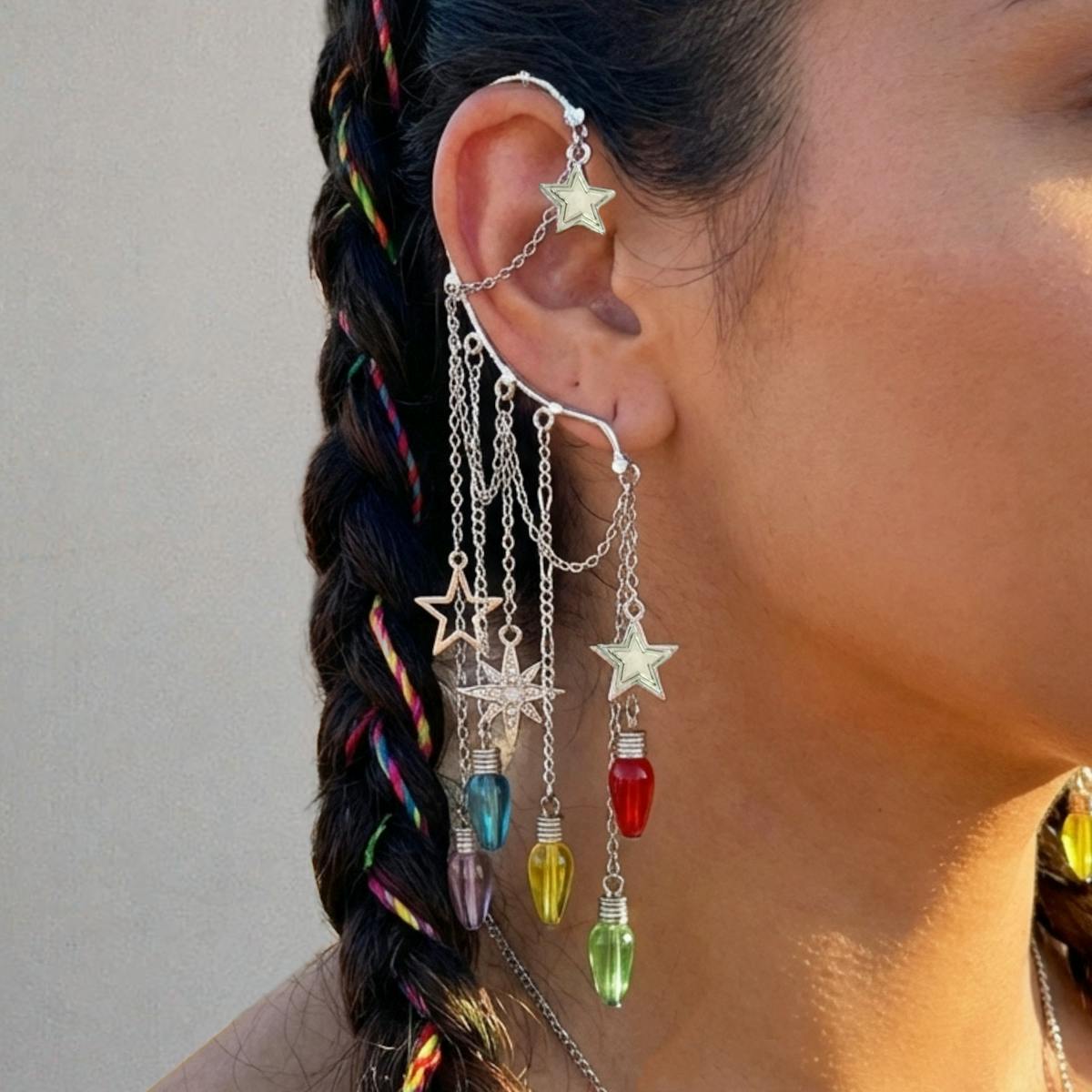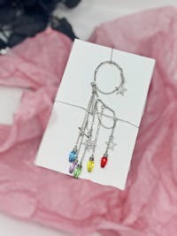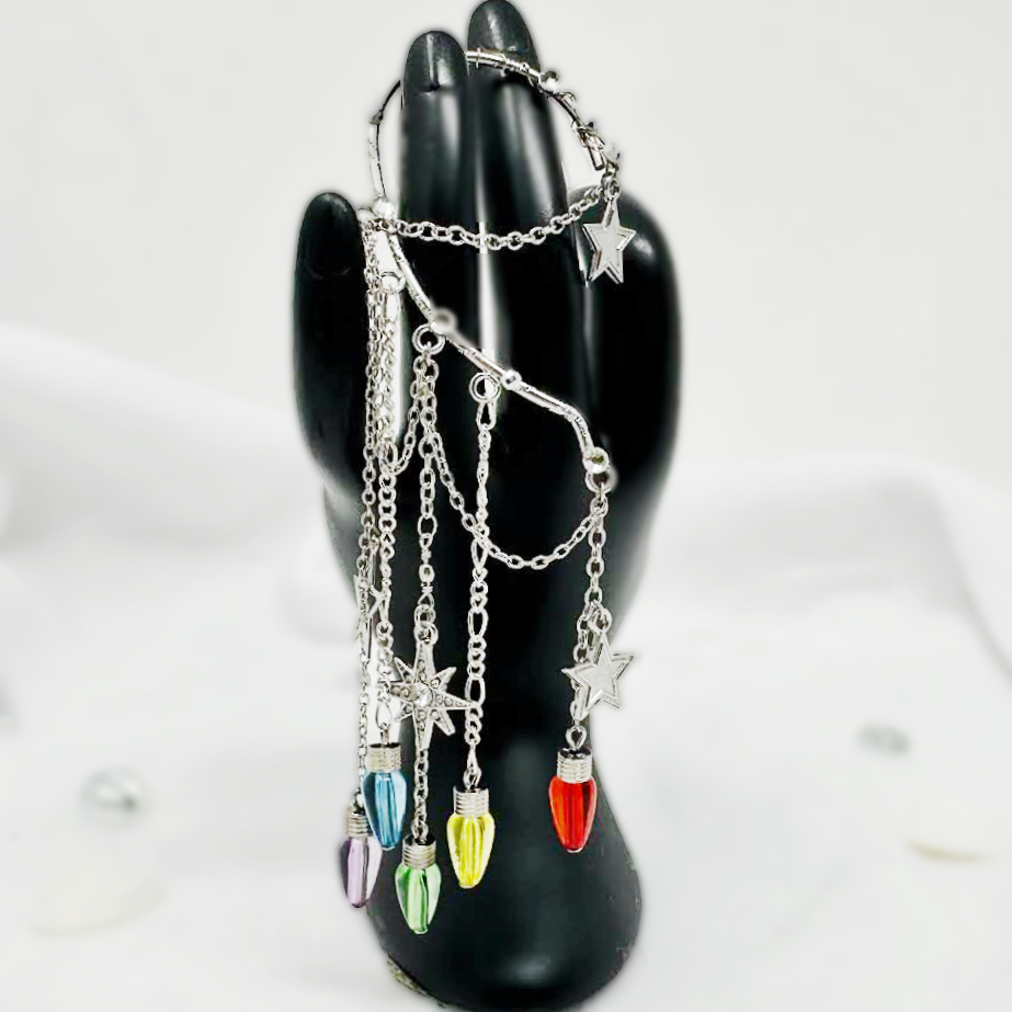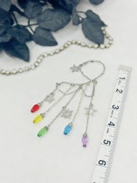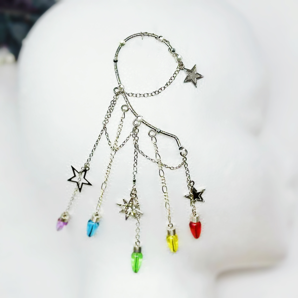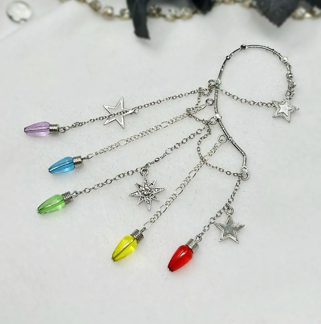 You will feel and look magical when you wear this gorgeous, silver tone, non-pierced dangle ear cuff with stars charms and colorful, rainbow faux ights over long drop chains. No piercing required! The one of a kind, single earring design is perfect for dressing up any outfit for festival fashion, rave wear, concert attire, pride events, fairy cosplay, and celestial jewelry gifts for her. You will get so many compliments whenever you wear this captivating ear wrap design.