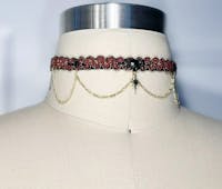You will feel sexy and elegant when you wear this gorgeous, red, black and gold ribbon choker with gold tone chains and black rhinestones. The gold tone, north star dangling charm at the center will keep all eyes on you. Perfect for dressing up your rave wear outfits, festival fashion, prom, rave wear, gothic wedding style, pirate jewelry and handmade Mother's Day gifts for her. The captivating embroidery design will get you so many compliments.